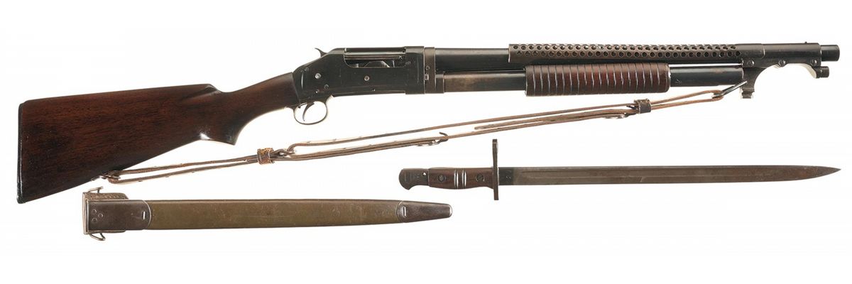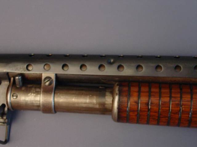 温彻斯特公司在1897型霰弹枪上进行改制,首先把枪管缩短到20英寸(508mm),然后在枪管上套上一个开有许多小孔的金属套管,套管前端有安装刺刀的W形刺刀座,以便霰弹枪也能够用刺刀突击和进行白刃战,套管靠近枪口位置的顶端还有一个圆粒状的小准星,但考虑到只用于近战,而没有设专门的照门,但在机匣顶部有一个凹形,可充作简易缺口式照门。为了减重,这个金属套管上还开有许多小孔,虽然该金属套管的作为就是为了安装刺刀座,但看起来就好像一个枪管隔热罩,而且事实上是能够起到隔热罩的作用,所以现在我们也能看到一些现代霰弹枪采用了类型设计但没有刺刀座的枪管隔热罩。